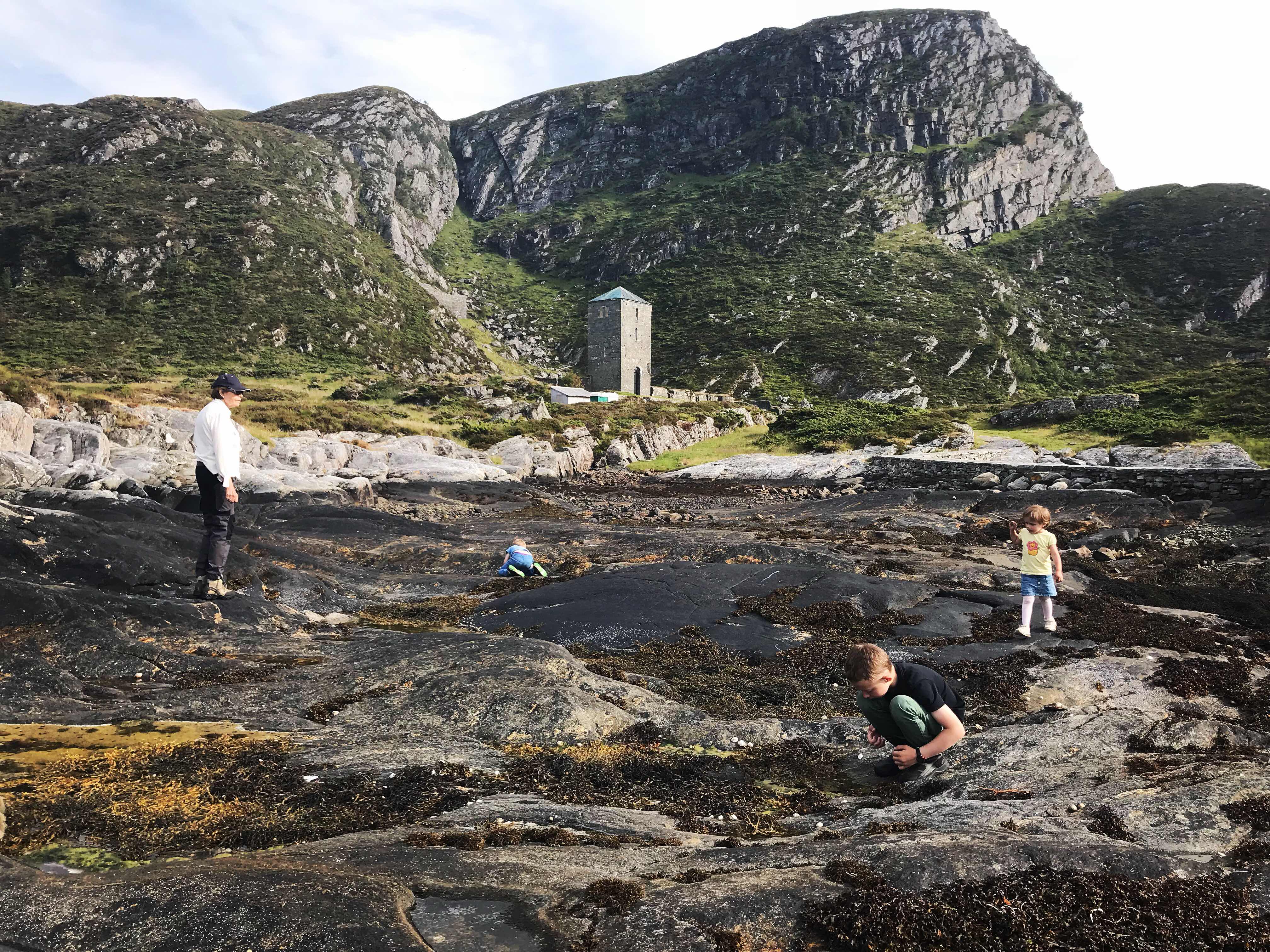 Fantastisk gøy å utforske og leke i fjæra nedenfor klosteret. Det er nokså stor forskjell på flo og fjære her. |